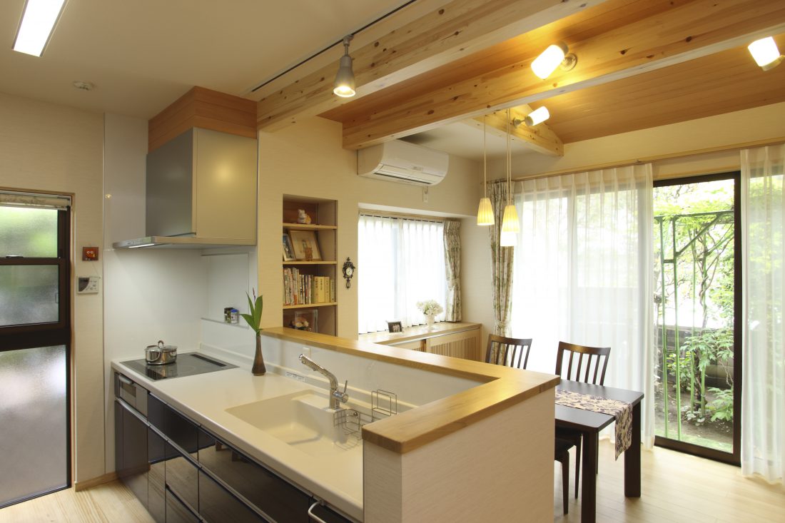 壁付けタイプのI型キッチンを長年使ってきた奥様が『せっかくリフォームするなら』、と待望の対面式キッチンに変更。システムキッチンには年齢の事も考えてIHクッキングヒーターを導入しました。