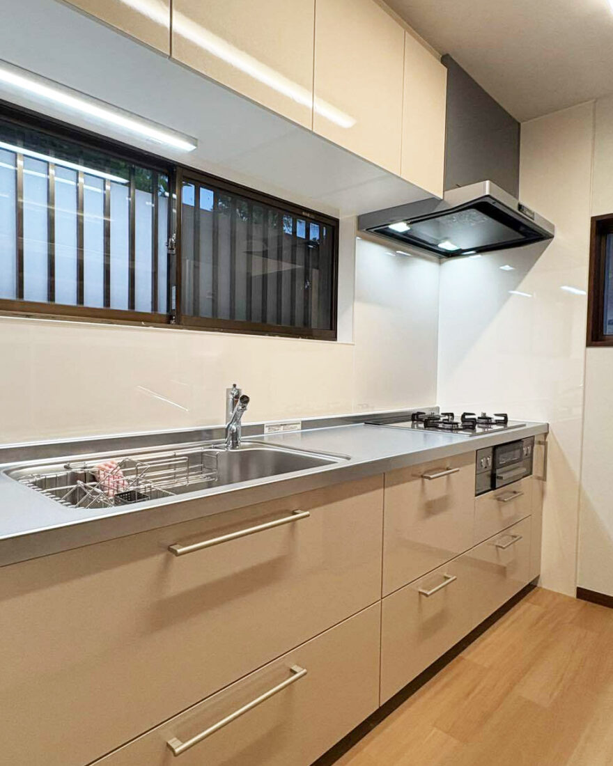 扉カラーは空間に馴染むテスートベージュに。キッチンパネルをホワイトにしたこともあり、空間が明るくなりました。