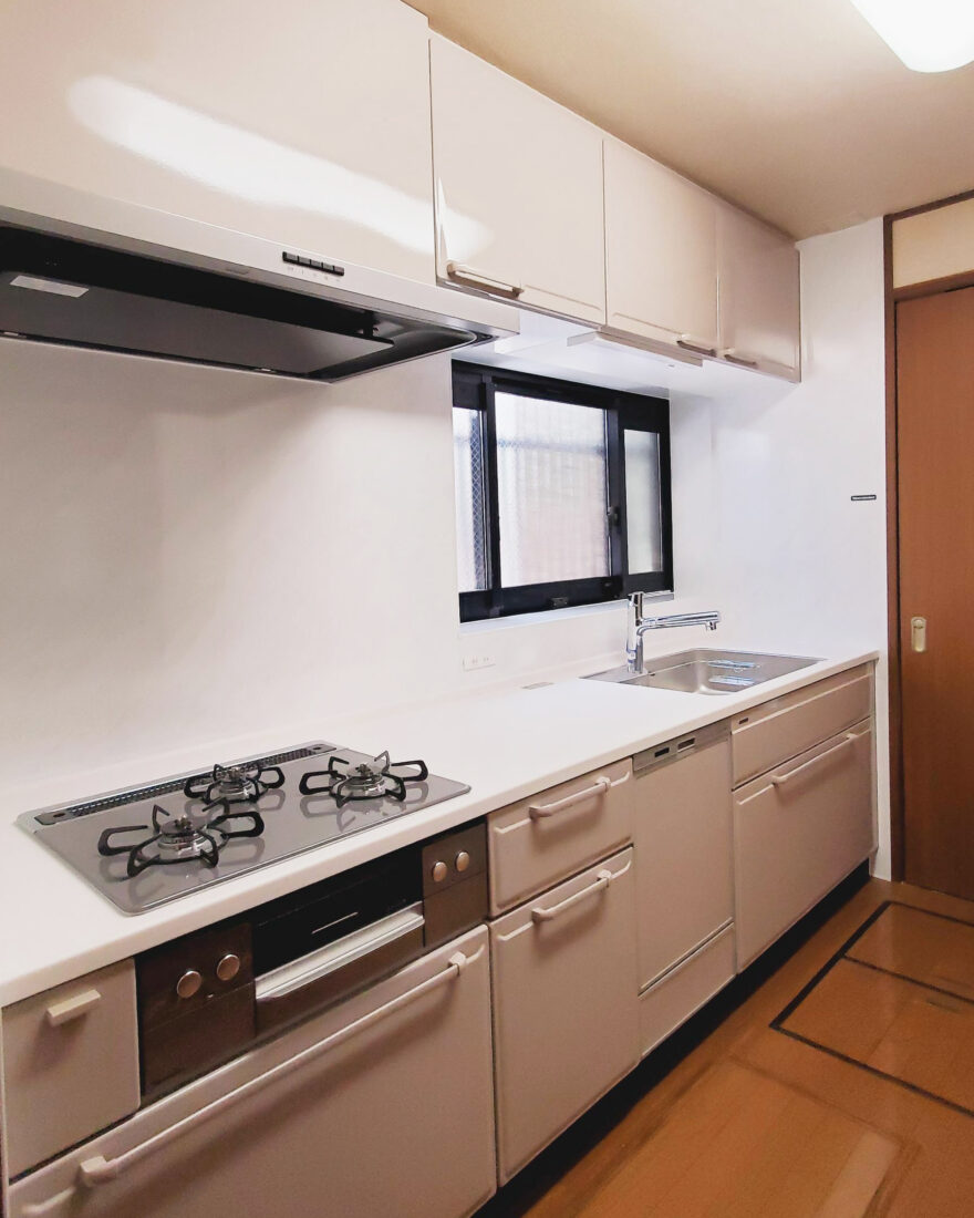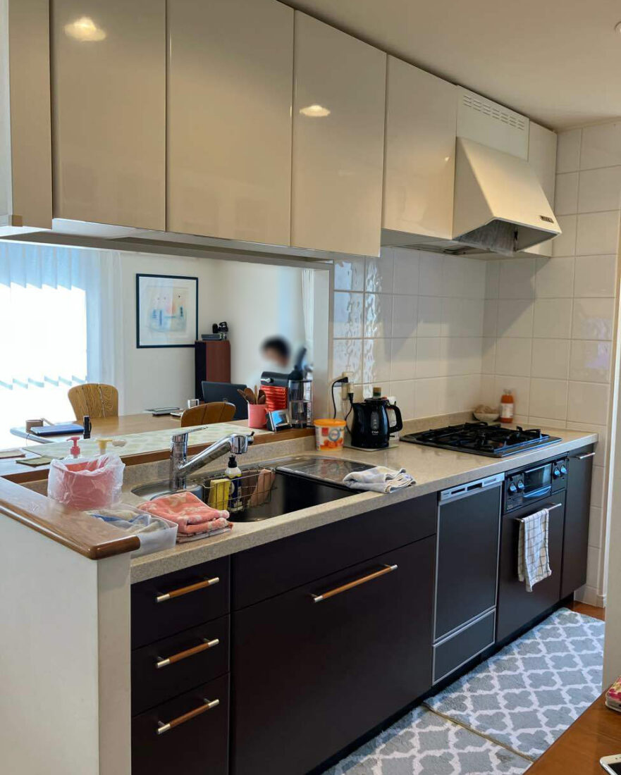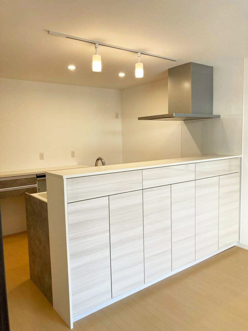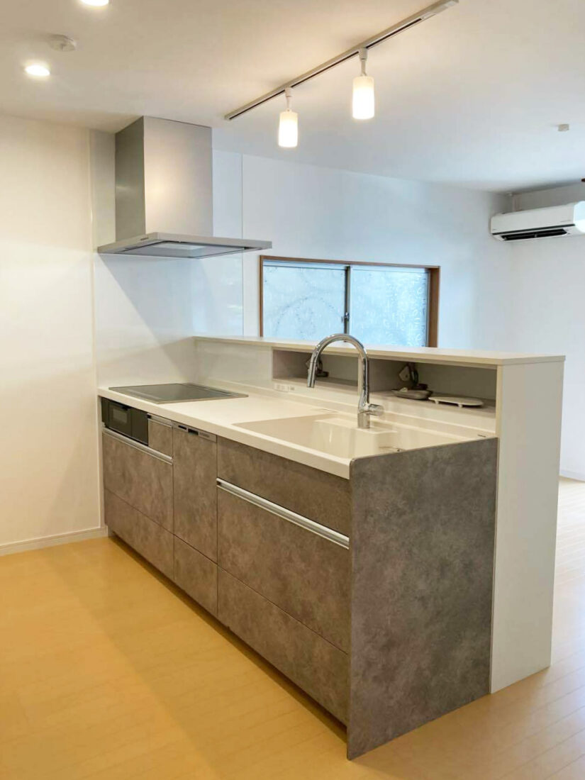 壁付けだったキッチンを対面式にリフォーム。キッチン側とリビング側で天板の高さが選べるデュアルトップ対面。ハイタイプは手元が見えないので、ほどよく生活感を隠せます。扉やカウンター、サイドパネルなどパーツごとで材質やカラーを自由自在にコーディネートできるのも特長です。デザインも使い勝手も良いキッチンは、家事をするのが楽しくなりますね。