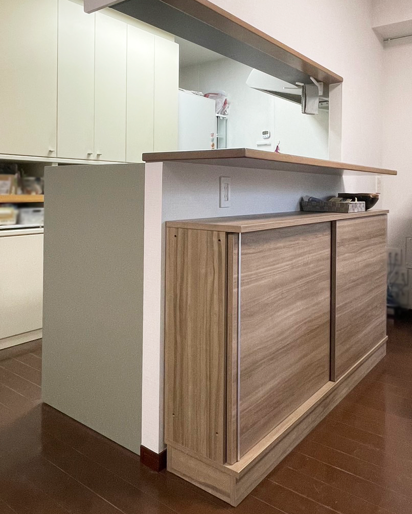 トクラスのコラージアにリフォーム。人造大理石のカウンターは、美しくなめらかな質感。汚れ・熱・衝撃に負けない高い耐久性も持ち合わせています。カウンター下のスペースを有効に使い、ぴったり収まる造作家具を設置。たっぷり収納できます。