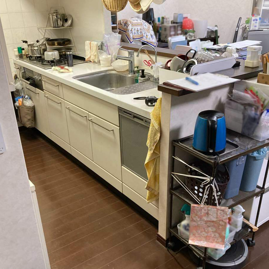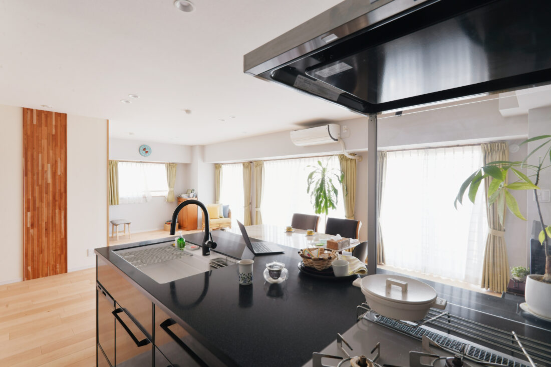 壁に囲まれて独立していたキッチンをリビングへ移動。キッチン横やリビングの窓から光が入り、オープンで明るい空間に。新設したキッチンはTOTOのミッテ。よく使うものを収納しやすくした「センターラインキャビネット」は楽な姿勢で取り出せて、家事効率もアップします。