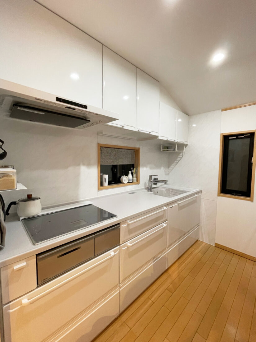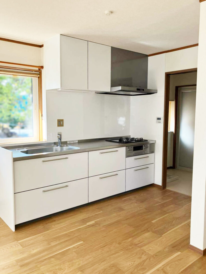 綺麗にお使いですが古くなってきたためリフォームしました。いつまでも色褪せず、汚れ・キズ・熱に強いアクリル人造大理石のワークトップ。シンクも同じ素材で接合部に段差や隙間がなく、お手入れしやすいのも特長です。お色は光沢のあるホワイト。照明の光が反射して、空間がより明るく見えますね。