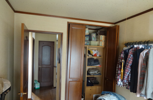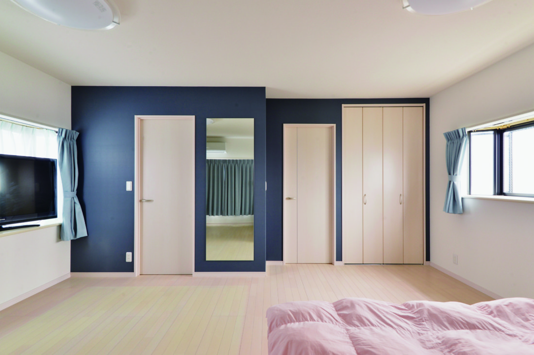 有効活用できていなかった洋室2部屋の間仕切りを撤去し、広々とした寝室にリフォーム。お子様含めた3人分の洋服などを収納できる大容量のウォークインクローゼットは、何度も打合せを重ねてベストな仕上がりに!K様邸のテーマカラーであるホワイトとアクセントクロスのネイビーの組み合わせで、洗練された落ち着いた空間になりました。