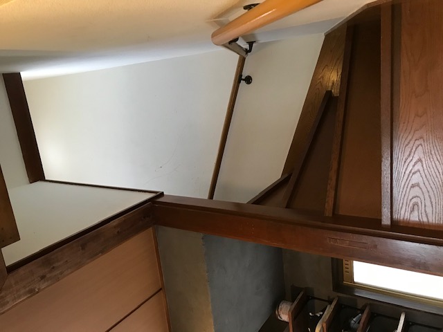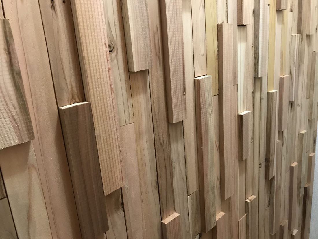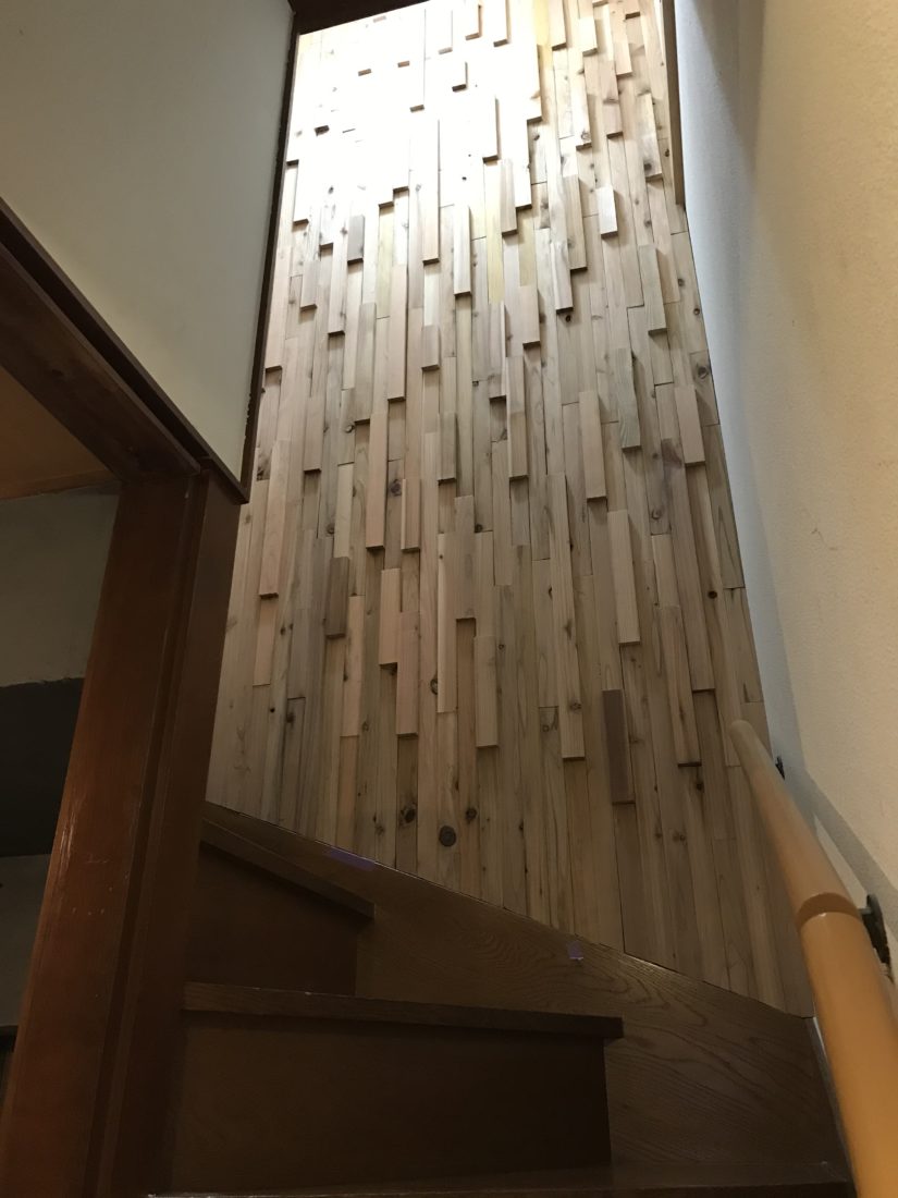 階段の壁面をリフォーム。立体感を出すために、厚みの異なる杉の無垢材を使い、あえてランダムに長さをカット。木材の表情が楽しめる壁面へとなりました。