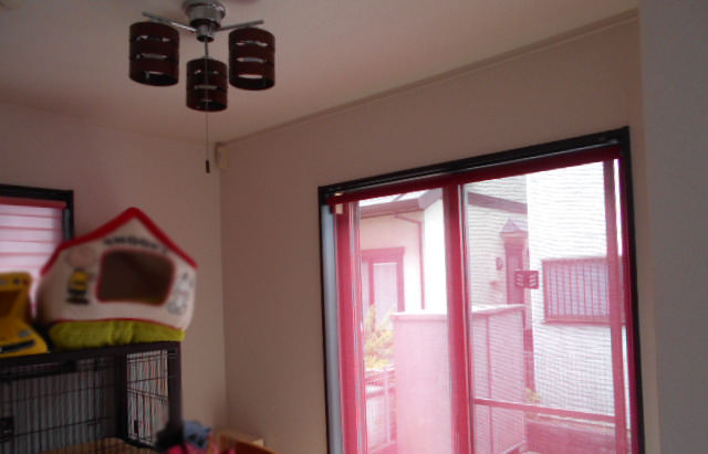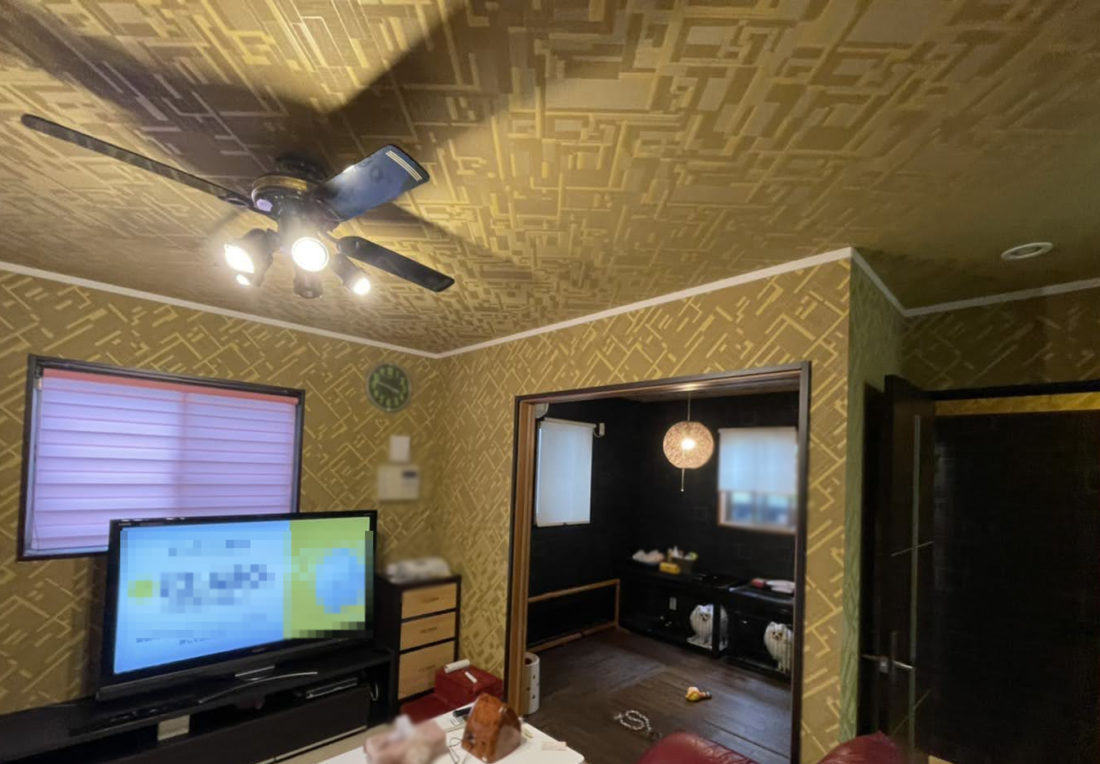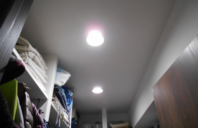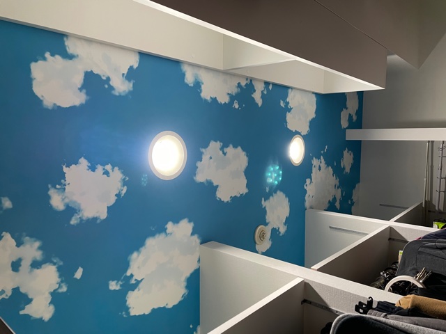 よくある白い壁と天井の収納部屋。ガラッとイメージチェンジで、天井に真っ青な空と白い雲のクロスを。