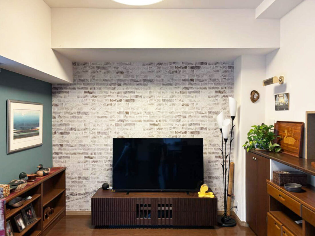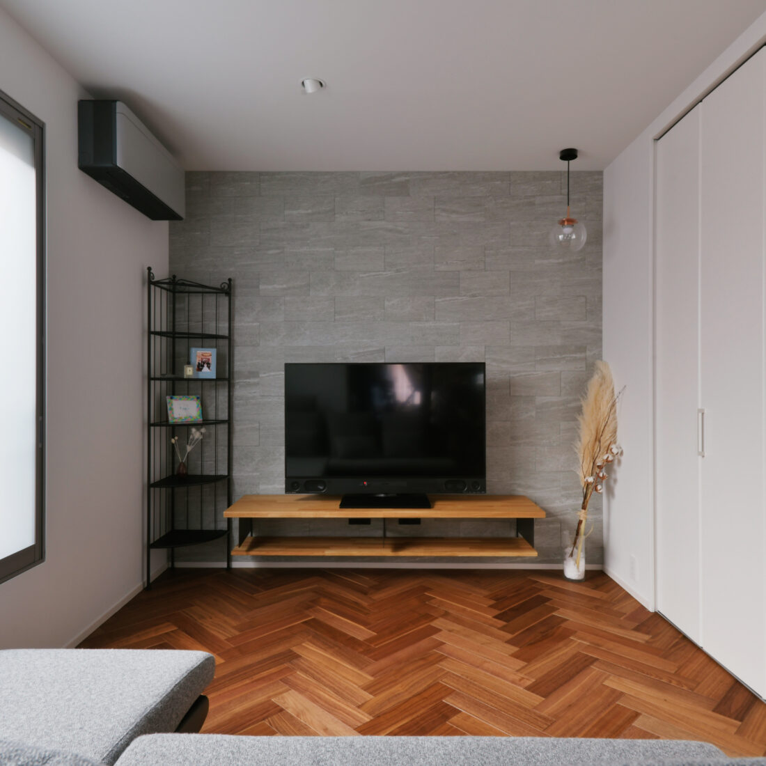- 床:挽き板ヘリンボーンフローリング(朝日ウッドテック )テレビ背面の壁:エコカラットプラス /ヴァルスロック(リクシル )テレビ台:オモイノ(ウッドワン) 内窓:マドリモプラマードU(YKKAP)