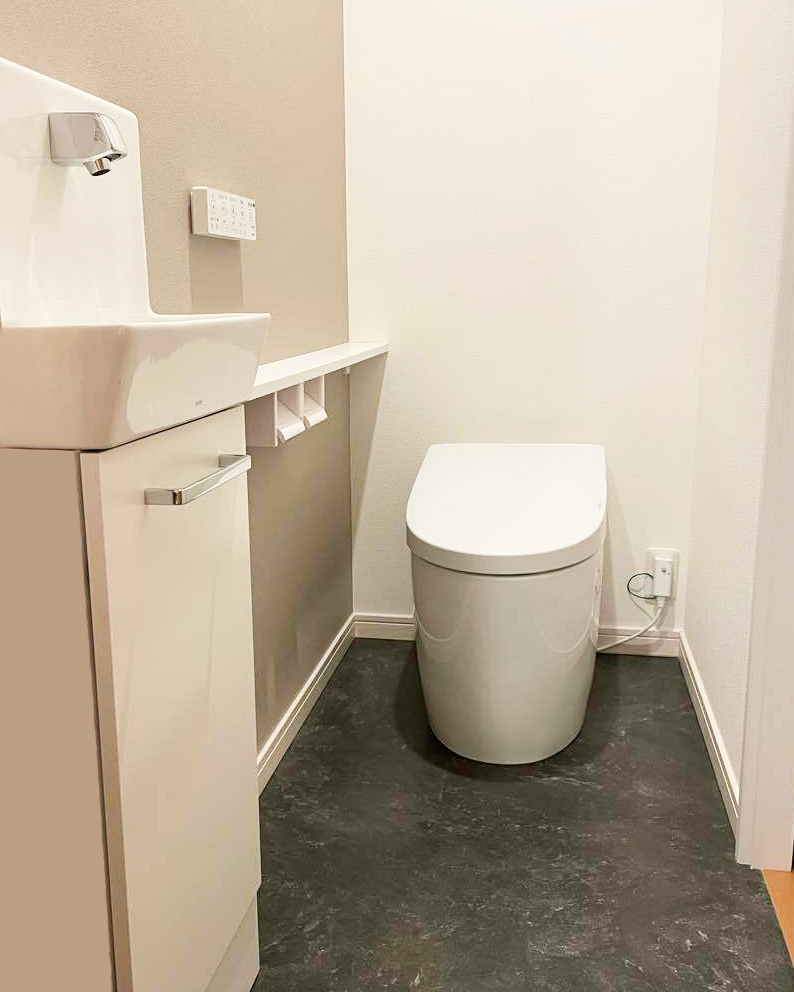 - トイレ:ピュアレストEX /アプリコットF3A(TOTO) 壁:FE76365、RE53742(サンゲツ) 床:SK22056(サンゲツ)