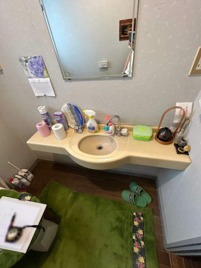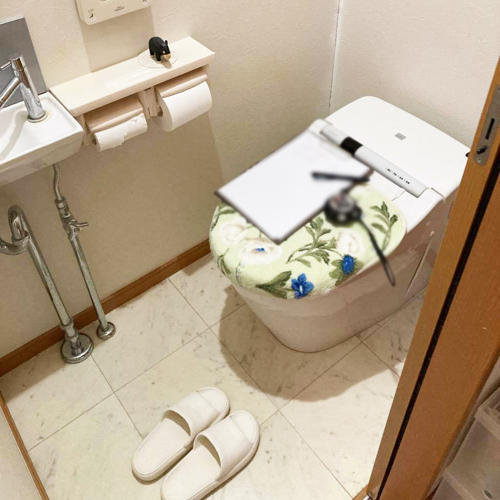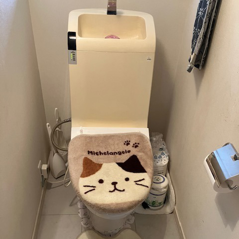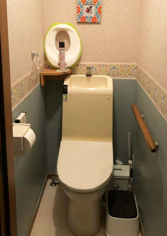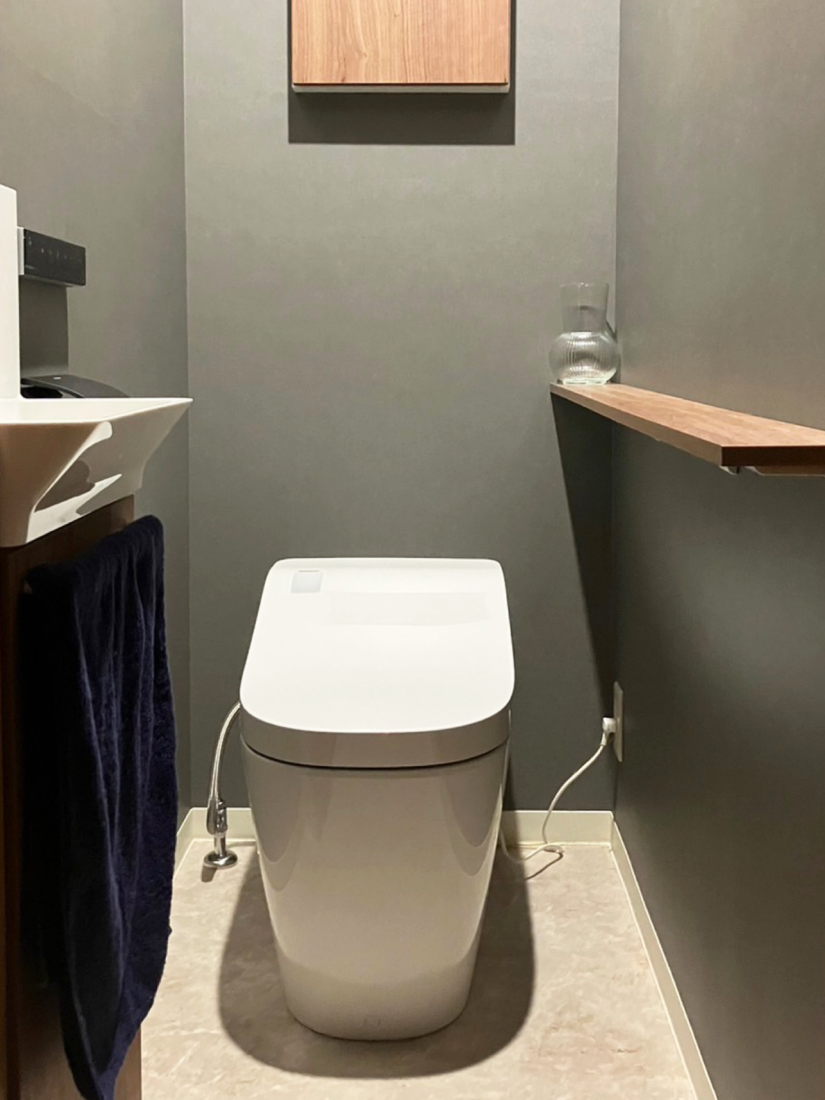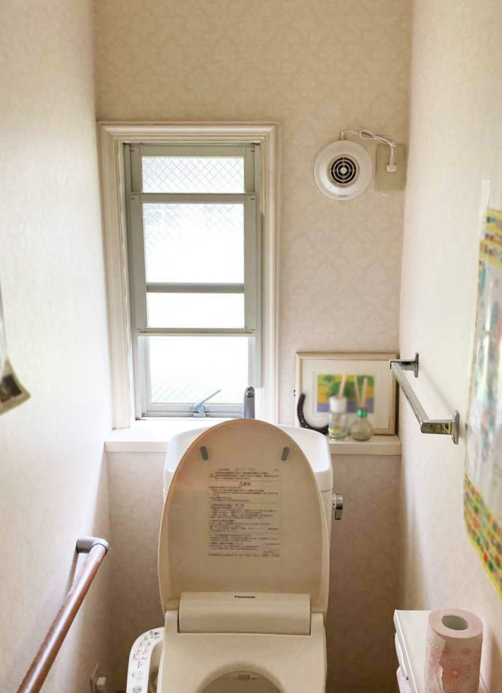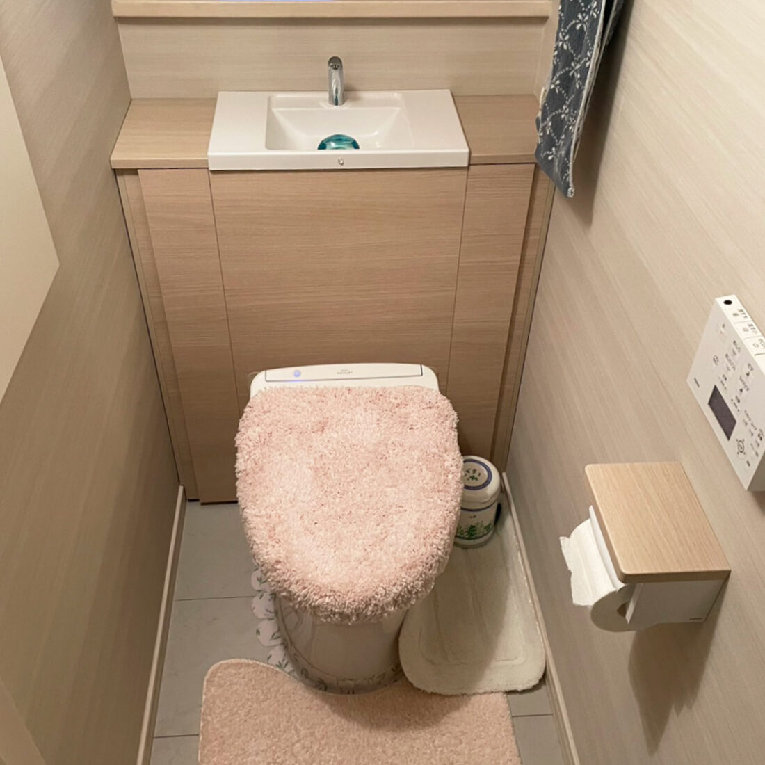 古くなったトイレをリクシルのアメージュに交換しました。アクアセラミック加工の便器は、ガンコな水アカも簡単に落とせて日頃の掃除の負担が減ります。さらに抗菌(銀イオン)パワーで細菌の繁殖も抑えられます。アクセントクロスはウニッコ柄の優しいベージュをチョイス。空間を柔らかく見せながら程よくアクセントになっていますね。