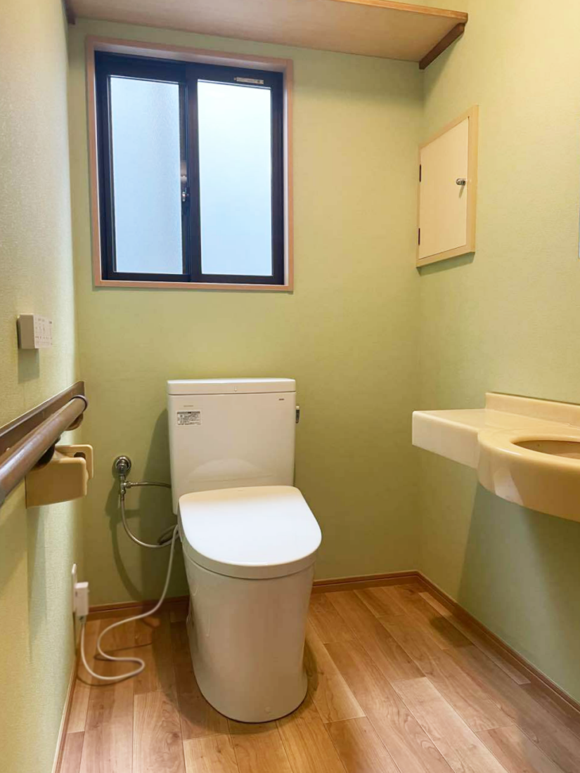 - トイレ:アメージュリトイレ/シャワートイレ(リクシル) 壁(アクセント):MRK3904(サンゲツ) 床:PM22153 (サンゲツ)