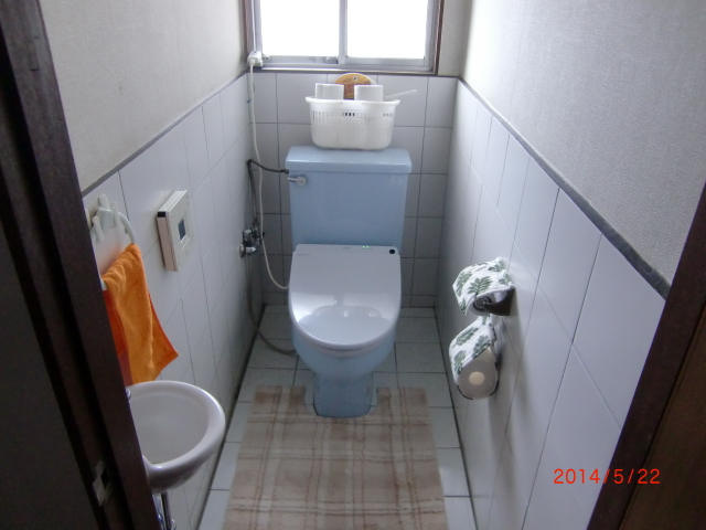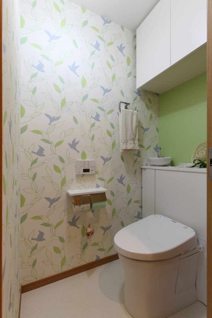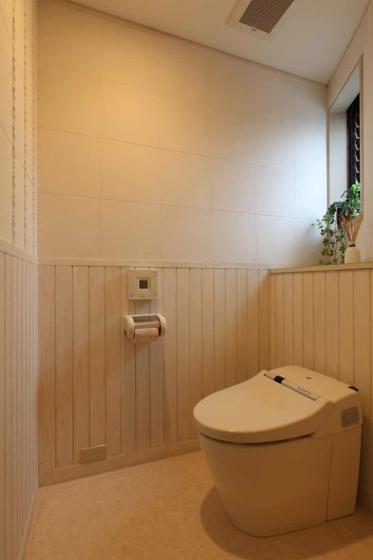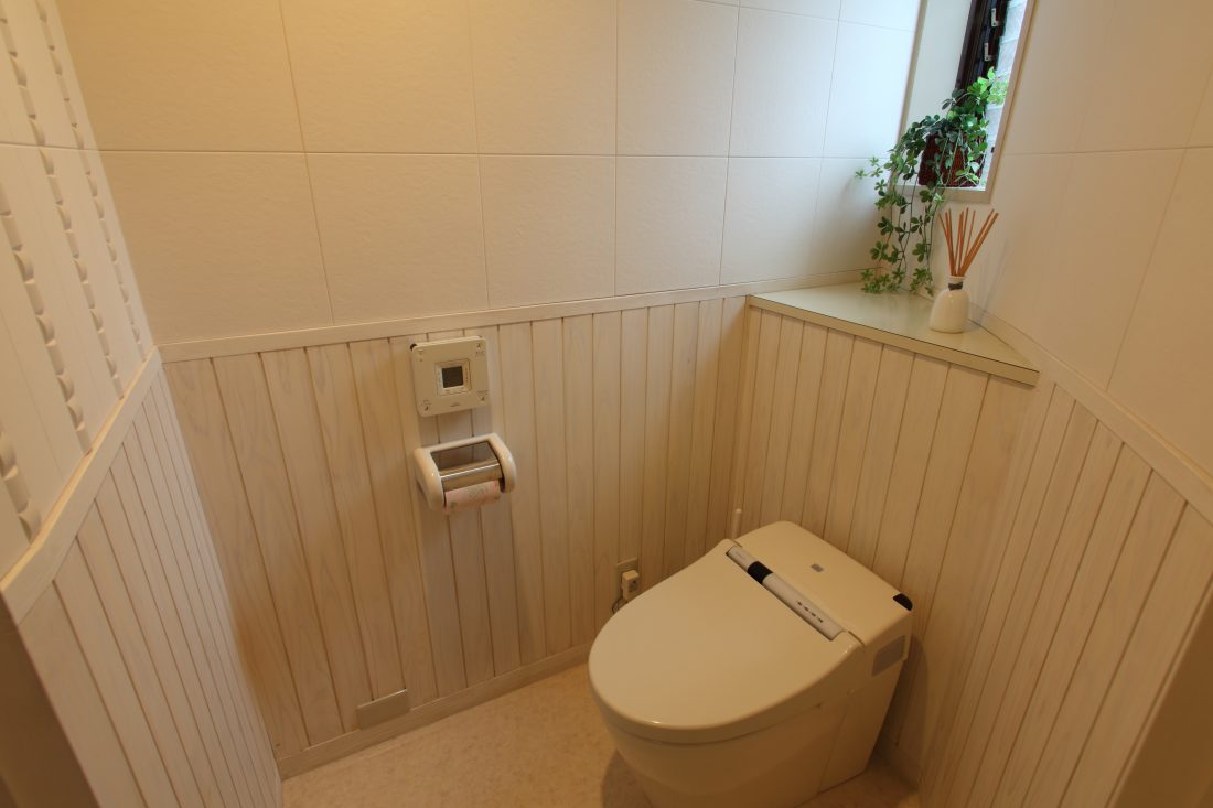 新しいトイレには水ハネが気になる壁にパネルを採用し、