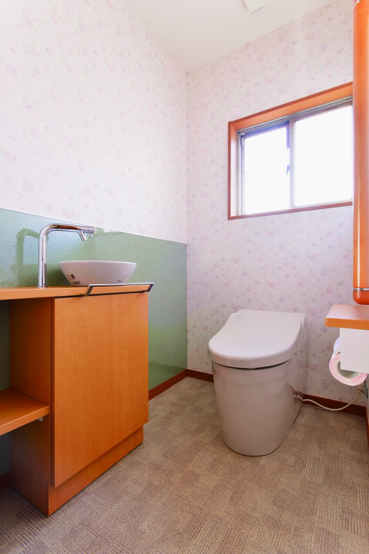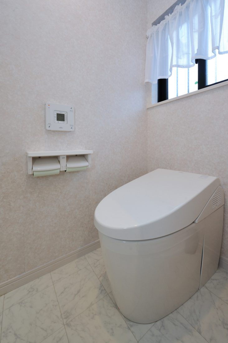 タンク部分が隠れてすっきりとしたトイレはTOTO:レストパルを採用。