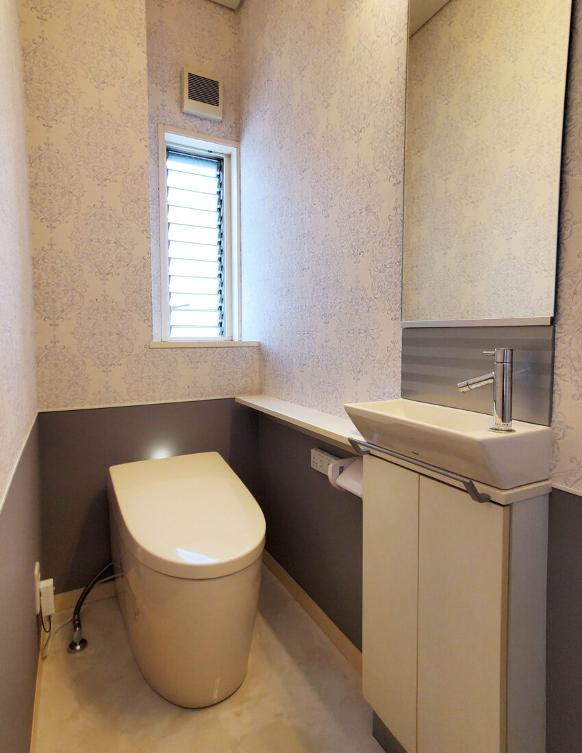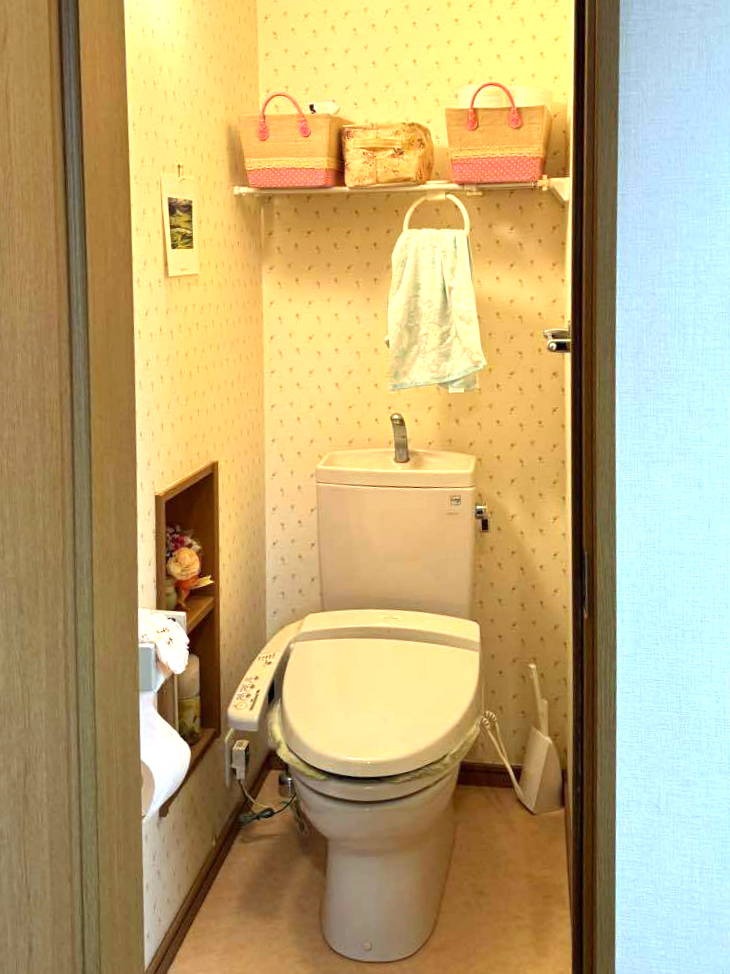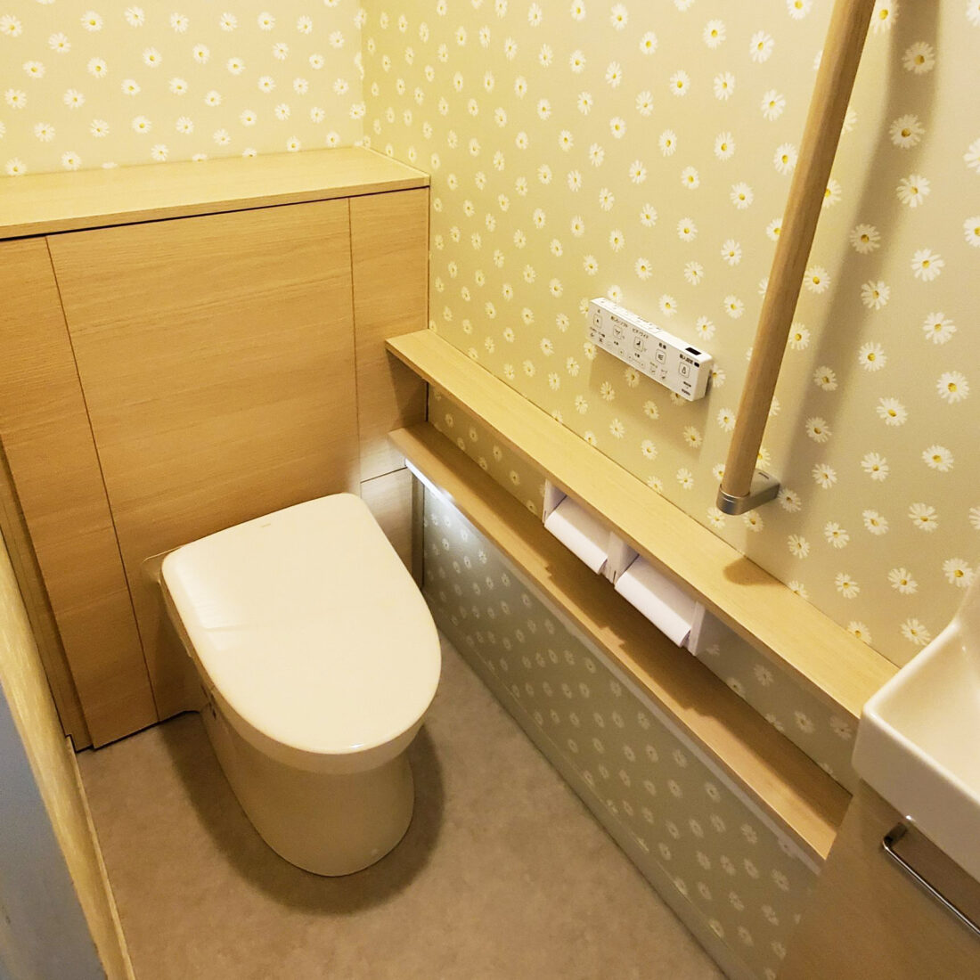 TOTOのレストパルにリフォーム。背面にあるキャビネットは見た目以上の収納力。トイレットペーパーやお掃除道具もすっきり!可動棚になっているので、入れる物に合わせて調節できます。壁紙は可愛いマーガレット柄を選び、華やかな空間になりました。