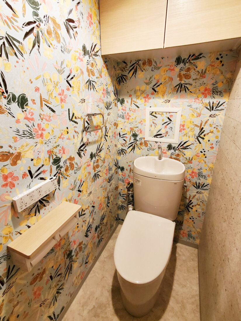 一番目を引くのは、サマードレスのような色鮮やかな花々を、水彩画で表現したクロス。反対側はシンプルな石目調のクロス。2種類の対照的なクロスで、メリハリある空間に。トイレがすっきりとしたフォルムなので、クロスが引き立ちますね。